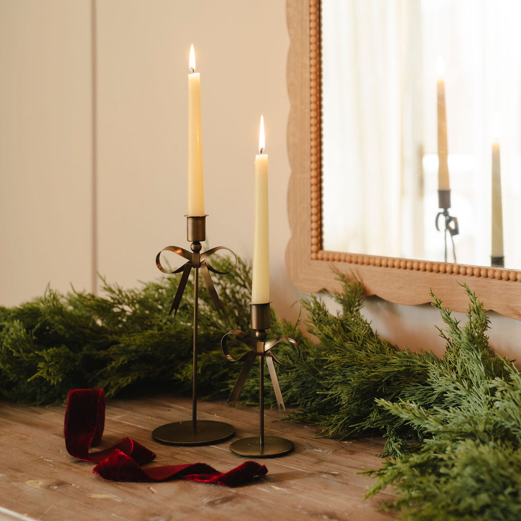 Elevate your home décor with this Set of 2 Regency Bow Antique Brass Candlesticks, designed to bring vintage sophistication and timeless charm to your space. Crafted from high-quality brass with a warm antique finish, each candlestick features a delicate bow detail along the stem, making them as decorative as they are functional.