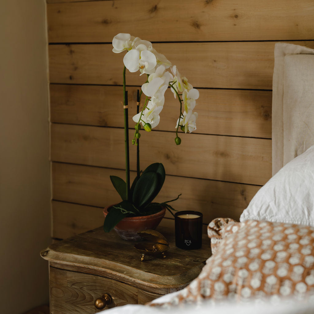 The lifelike white orchid stems showcase realistic petals and vibrant green leaves, creating a fresh botanical look without the maintenance of real plants. Set in a natural terracotta pot, this artificial orchid arrangement adds texture and warmth to coffee tables, console tables, shelves, bedside tables, and office spaces.